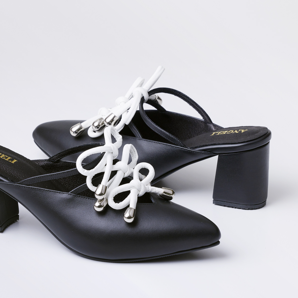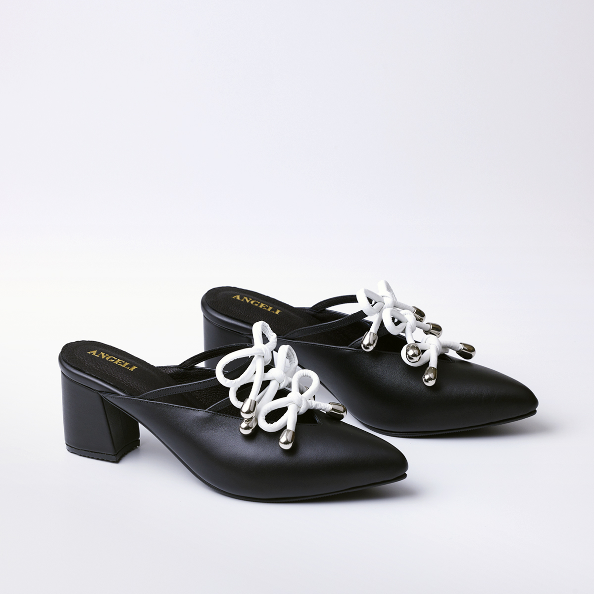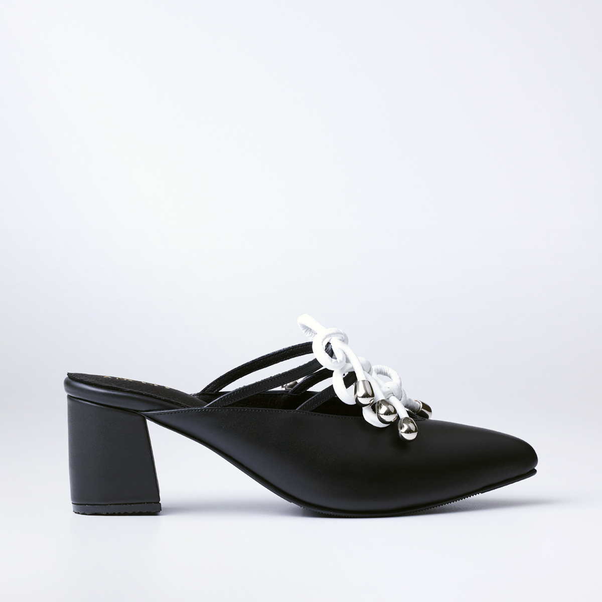 Closed-toe shoes with three bow ties up to the instep, open back, and a two-inch block heel.