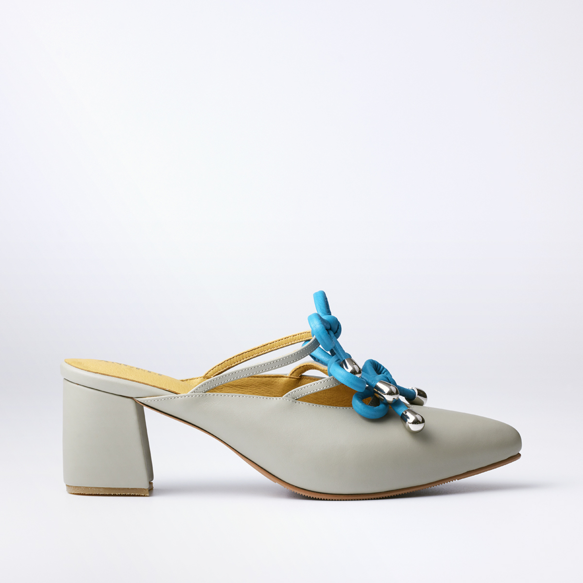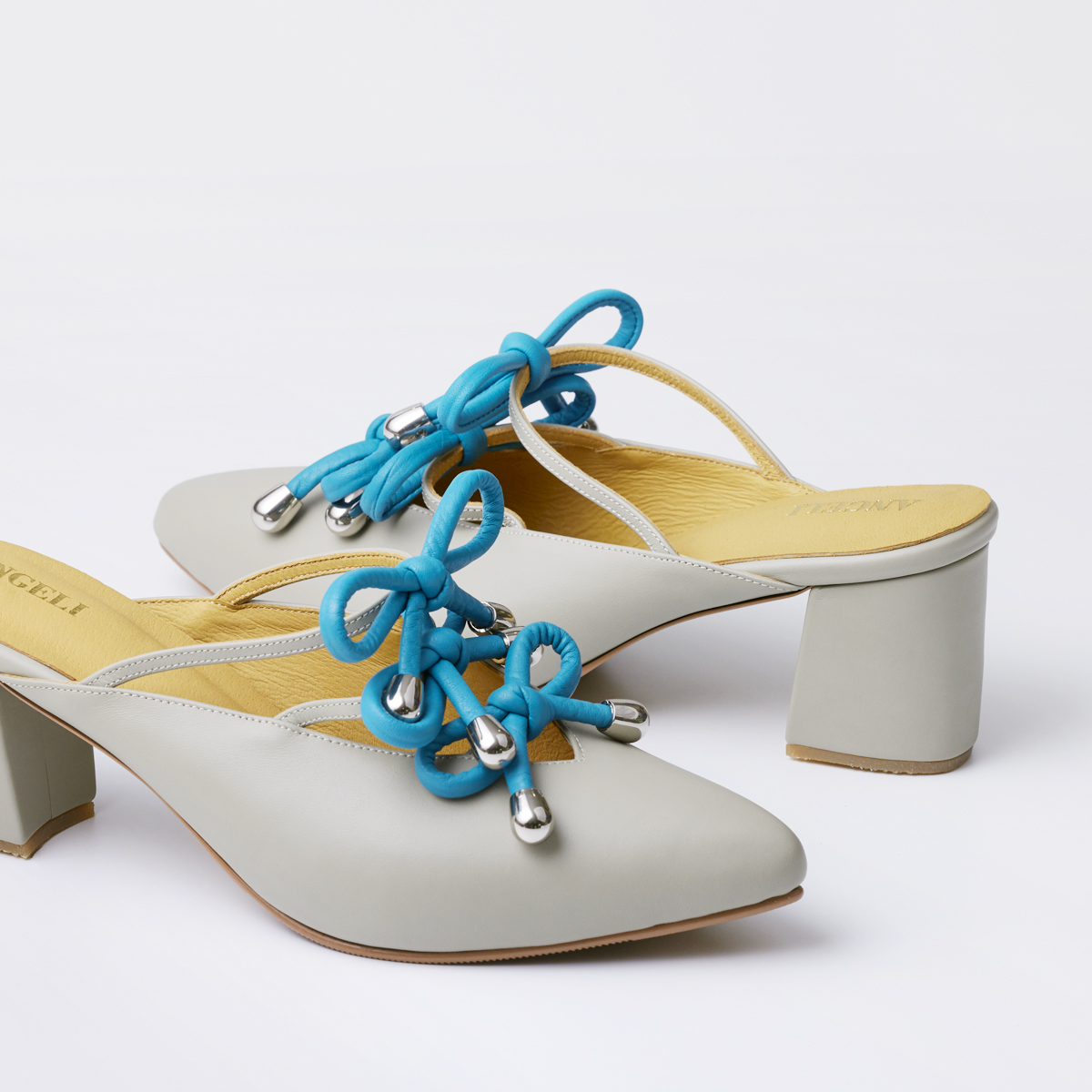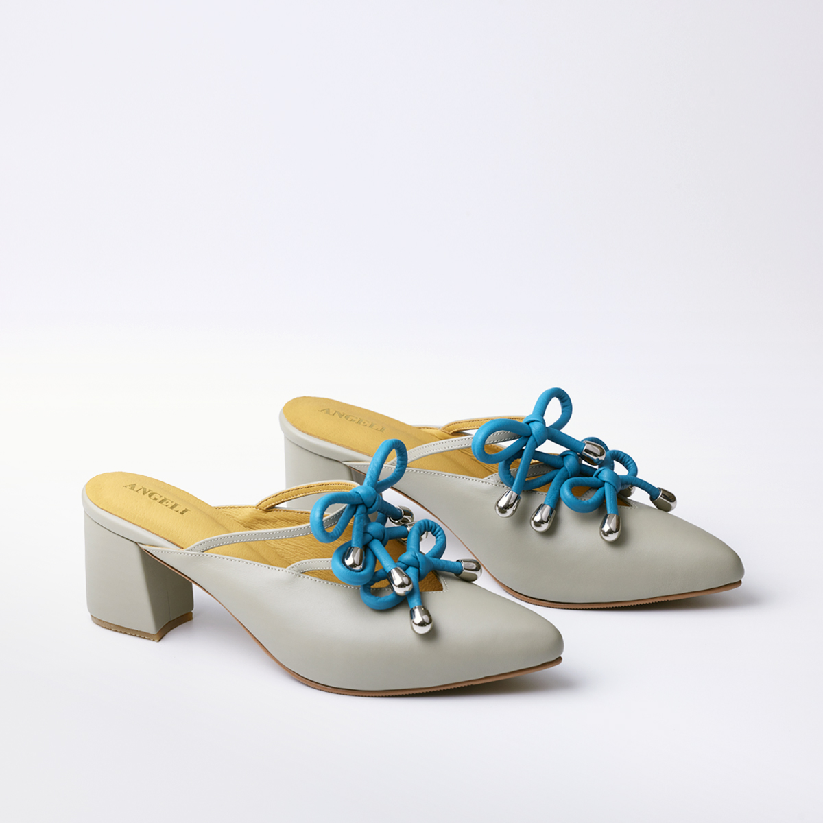 Closed-toe shoes with three bow ties up to the instep, open back, and a two-inch block heel.