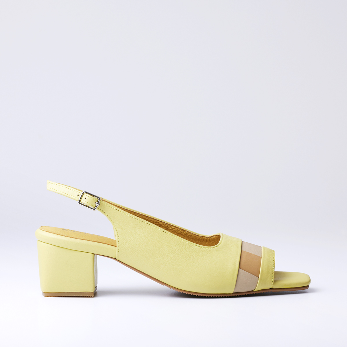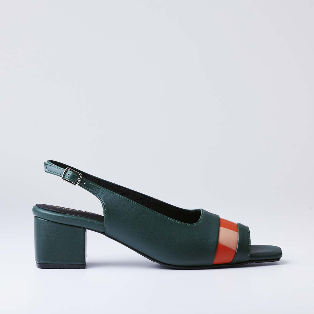 The shoes are open-toe, have a back strap, are open at the heel, with a two-inch block heel.